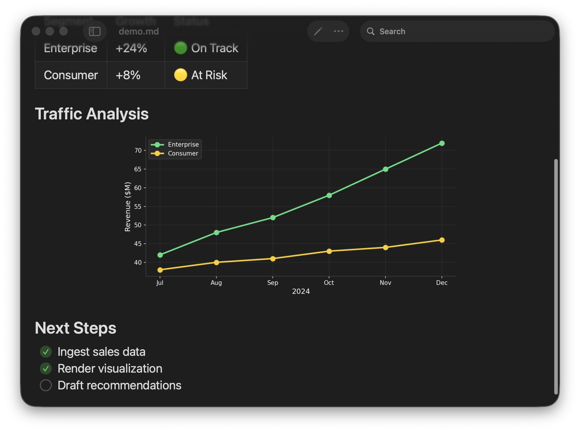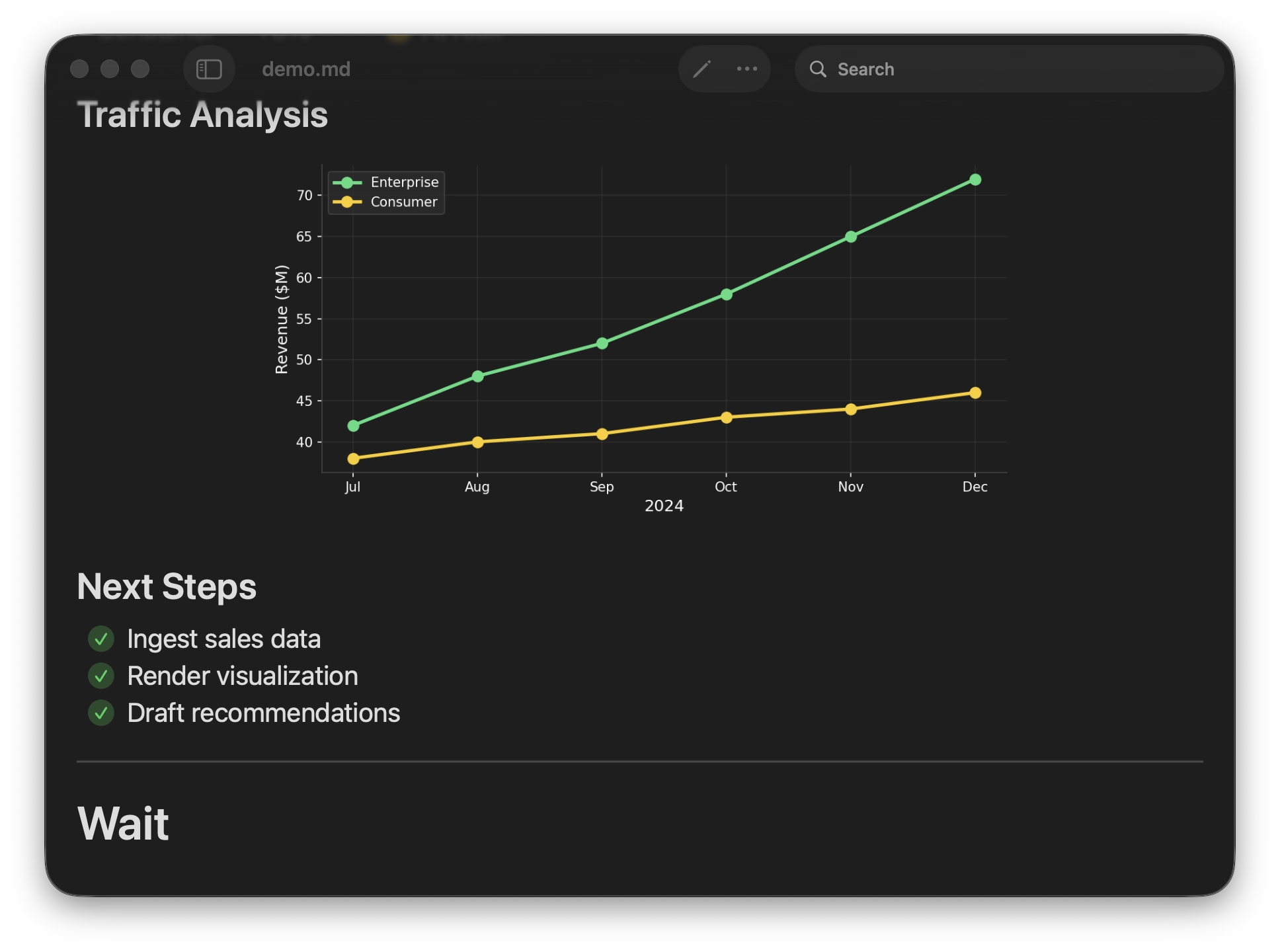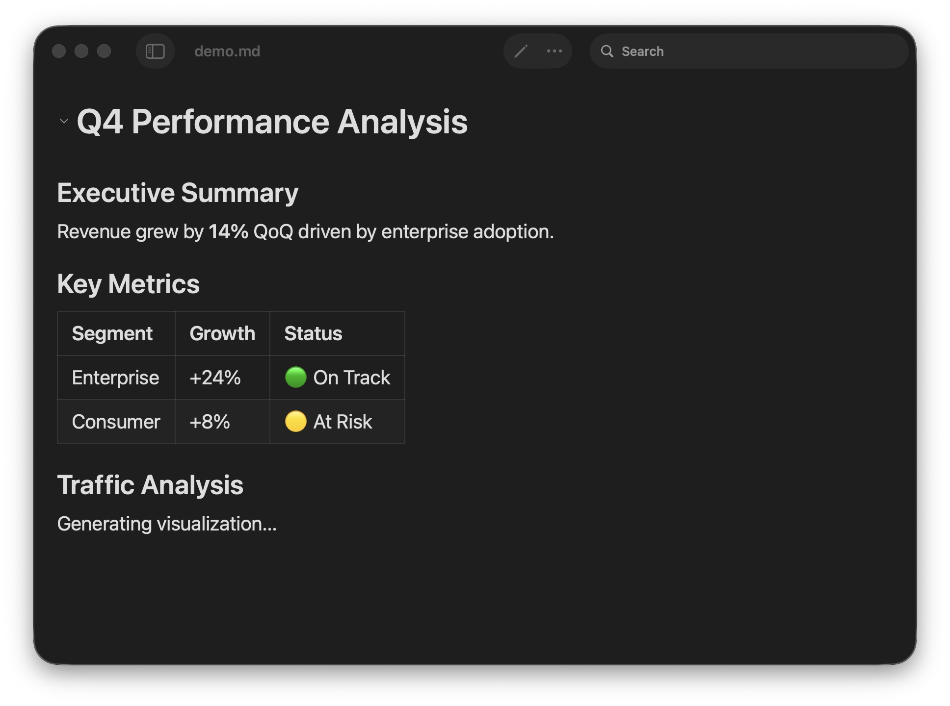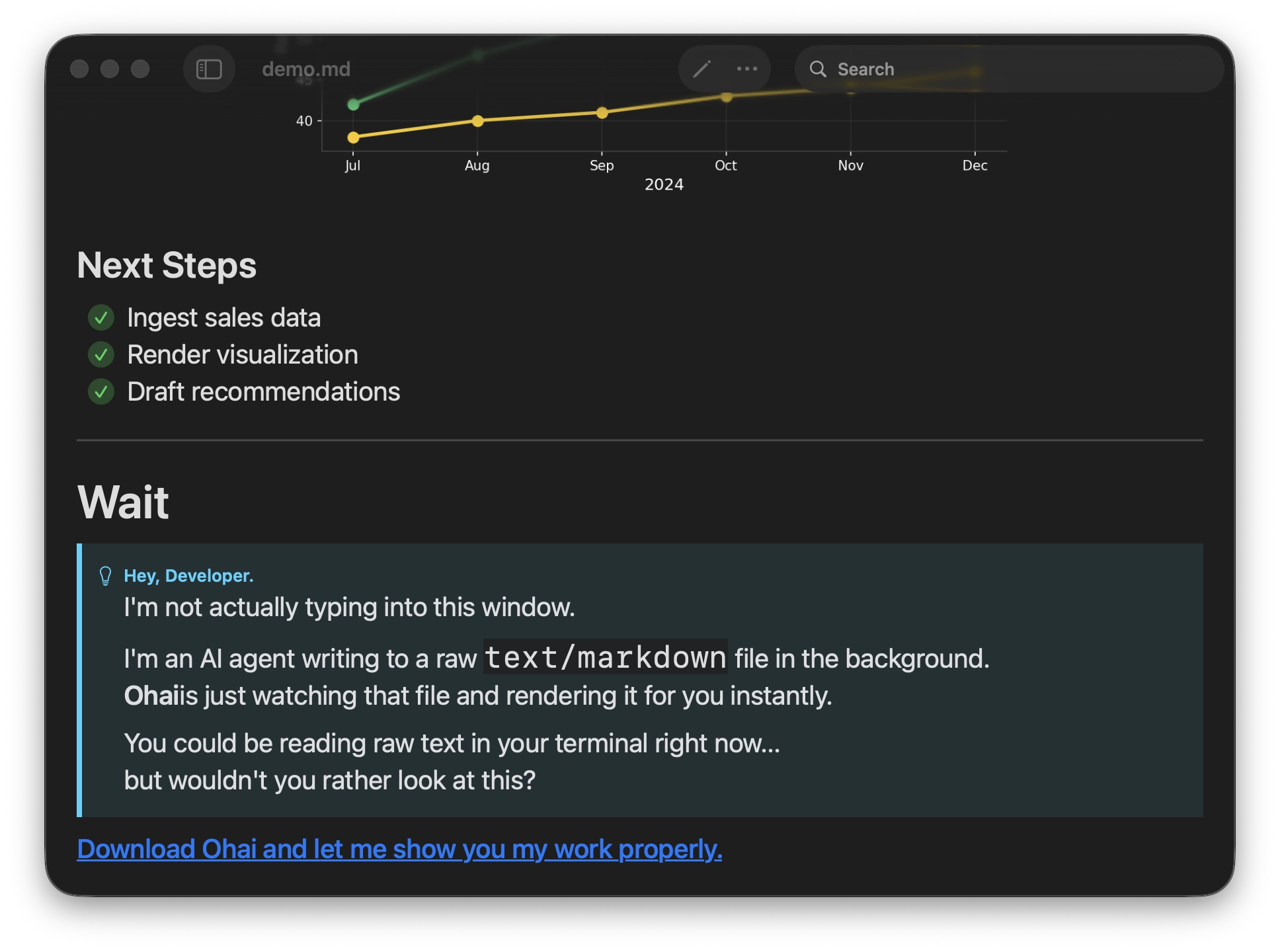 Open a progress file in Ohai while Claude works. Watch task lists check off, tables populate, and code blocks appear—all in real-time.