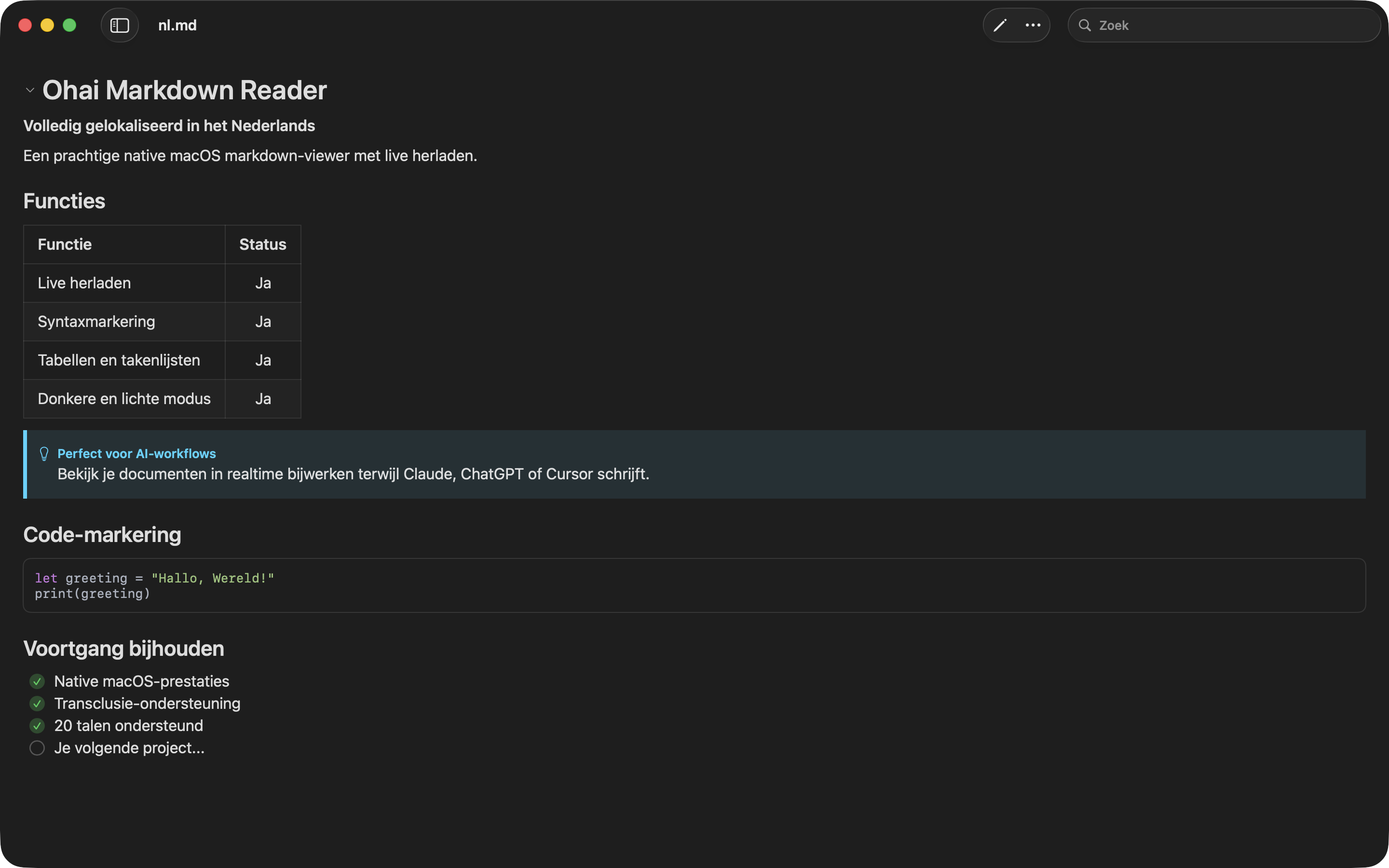 Een AI-first markdown-viewer voor macOS die uw markdown-bestanden in realtime weergeeft. Perfect voor AI-programmeerassistenten, documentatieworkflows en iedereen die met markdown-bestanden werkt.