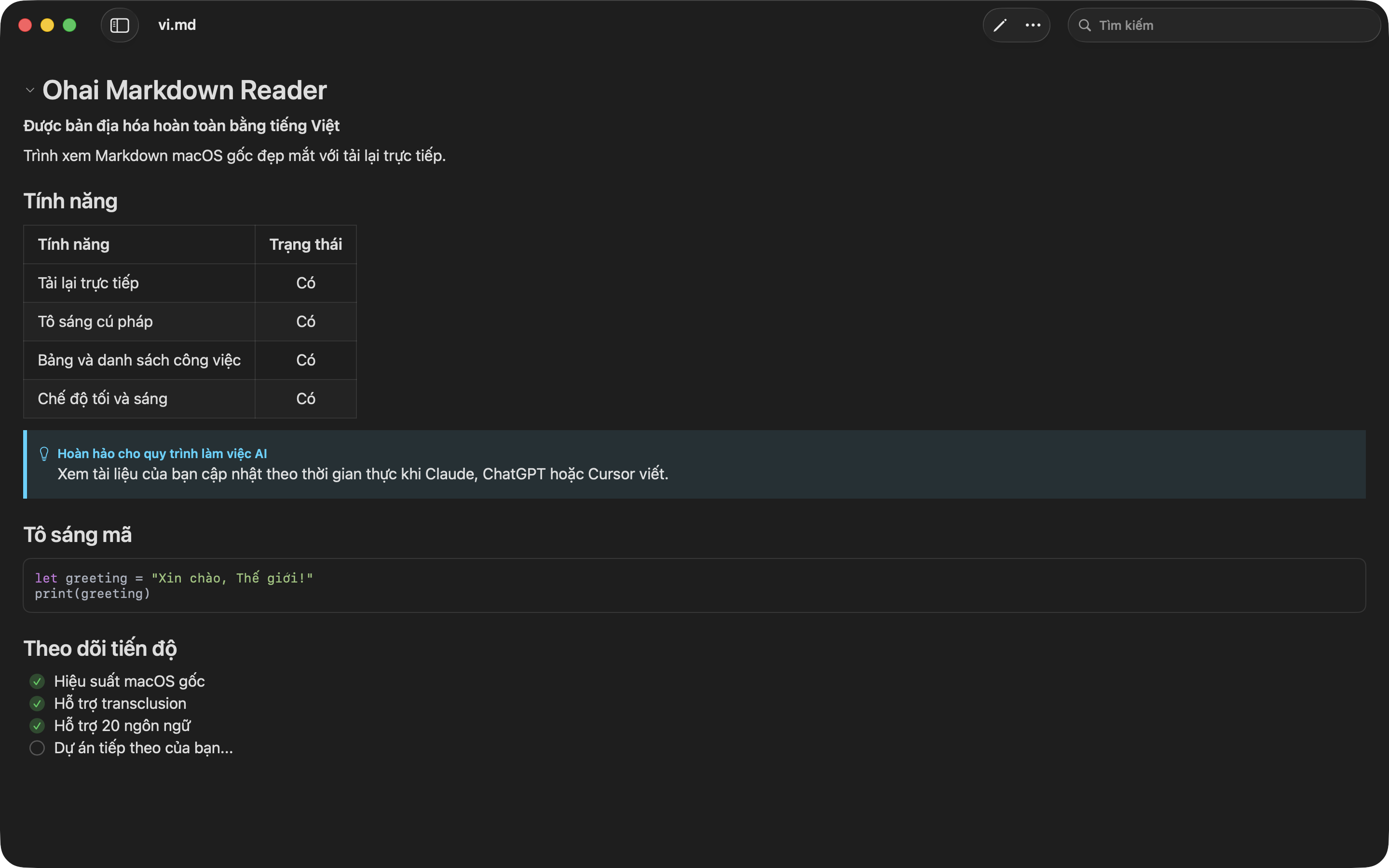 Trình xem markdown gốc macOS hiển thị các tệp markdown theo thời gian thực. Hoàn hảo cho trợ lý lập trình AI, quy trình tài liệu và bất kỳ ai làm việc với tệp markdown.